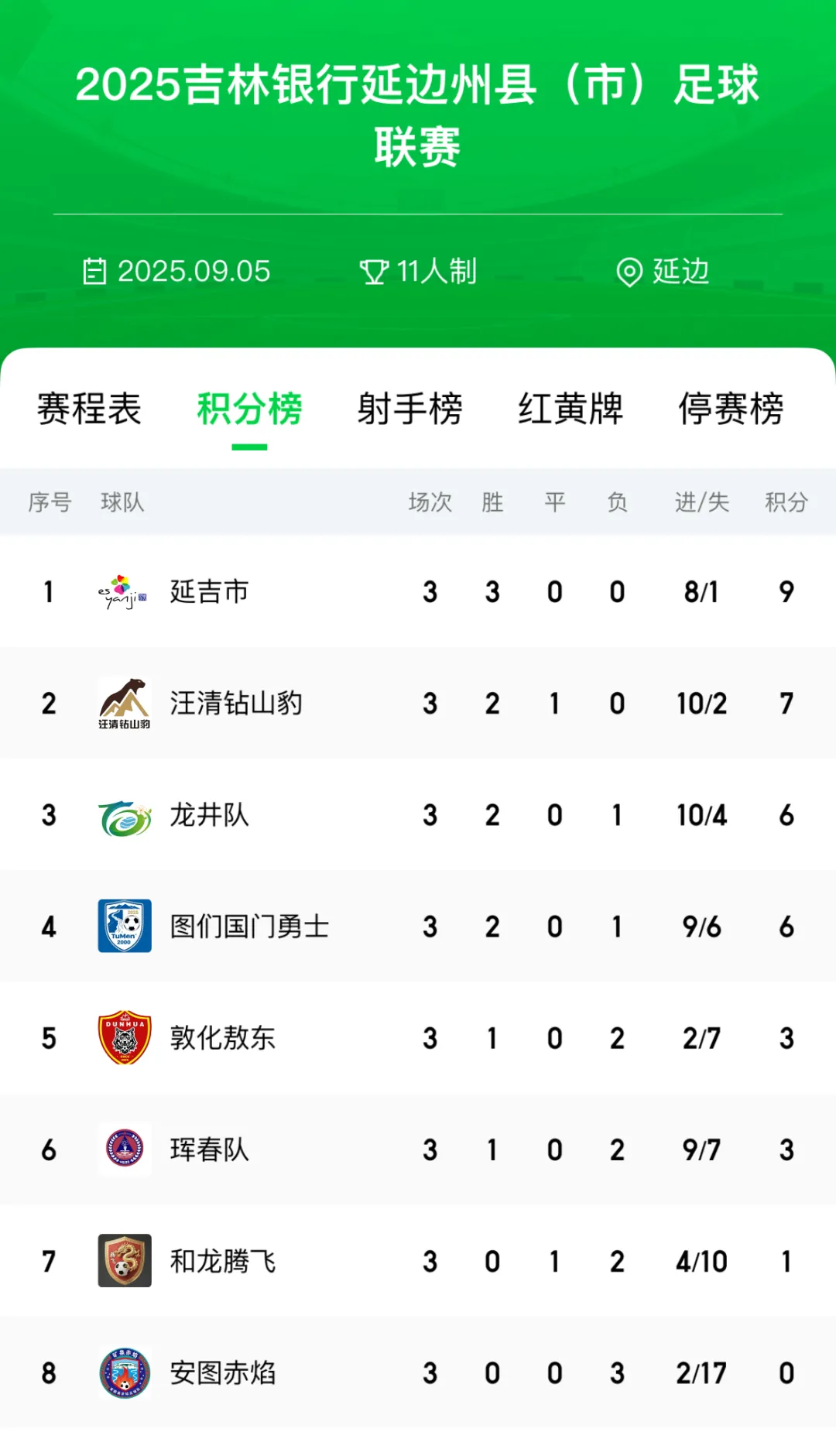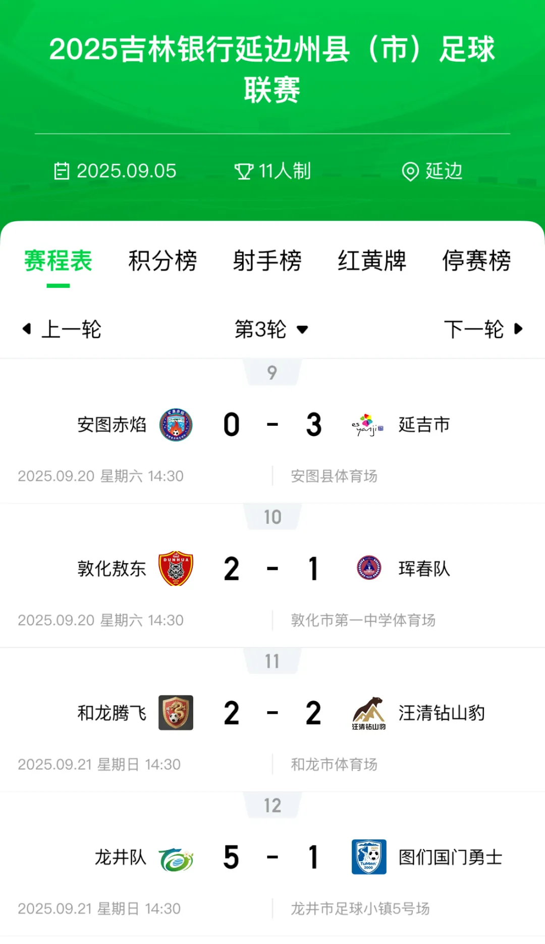 2025 길림은행 연변현(시) 축구리그가 제3라운드 대결을 마쳤다. 리그가 시작된 이래 첫 무승부도 나왔고 생각지 못했던 이변도 있었다. 연길팀은 1위로 우뚝 올라서며 서서히 우승팀의 륜곽을 보여주기 시작했다.
