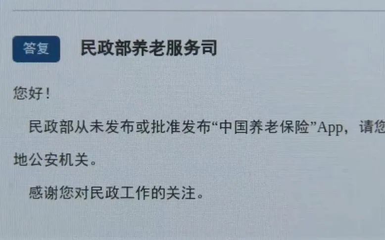 CCTV 뉴스 9월 23일 보도에 따르면 최근 인터넷에 떠도는 '중국양로보험’ 앱에 대한 의문과 관련하여 민정부 양로봉사사는 최근 공식 경로를 통해 네티즌들의 우려에 정식으로 답했는바, 민정부는 종래로 '중국양로보험'이라는 ...