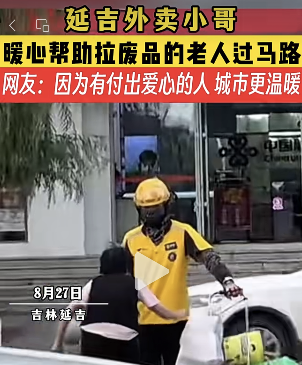 8월 27일 연길시민은, 페품을 밀차에 싣고 길을 건너는 로인에게 따뜻한 도움의 손길을 준 배달원의 모습을 핸드폰으로 기록했다.