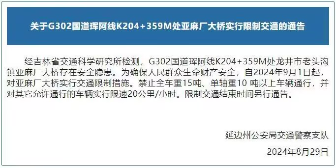 G302국도 룡정시 로투구진 아마공장 다리에 잠재적인 안전위험이 존재하고 있다. 인민군중의 생명과 재산안전을 담보하기 위해 2024년 9월 1일부터 아마공장 다리에 교통제한 조치가 실시된다. 차량 무게가 15톤, 외축 중량이...