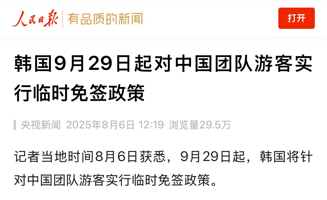 한국, 중국 단체관광객 대상으로 림시 무비자정책 실행
