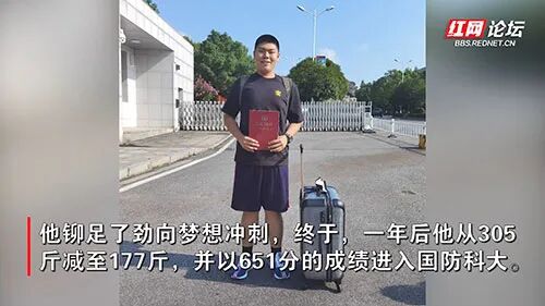 고중 때까지만 해도 305근이였던 그는 놀라운 의지력으로 짧은 500일동안 128근 감량했으며 651점이라는 우수한 성적으로 국방과학기술대학에 입학했다.