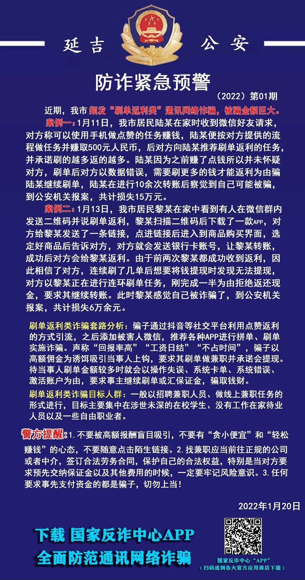 사례2: 1월 13일 연길시민 려모는 위챗그룹내 한 사람이 큐알코드를 보내면서 허위 주문하면 돈을 번다고 선전하는 것을 보았다. 려모는 큐알코드를 스캔한 후 APP를 다운받았고 상대방은 려모에게 링크를 보내왔다. 링크를 클릭한 후 제품구매 페이지가 열렸고 제품을 선택한 후 상대방에게 알려주면 상대방은 은행카드 계좌를 보내오면서 려모더러 입급하도록 했다. 성공한 후 상대방은 려모에게 돈을 지불했다. 앞서 두차례 모두 돈을 벌게 된 려모는 상대방을 믿게 되였고 련속 몇번 허위 주문을 한 후 돈을 빼내려고 보니 돈을 뺄 수가 없었다. 상대방은 려모가 현재 련속 허위 주문을 진행하고 있고 절반밖에 완성하지 못했다는 리유로 현금을 돌려주지 않았고 계속 입금할 것을 요구했다. 이때 려모는 자기가 사기당한 것을 감지하고 공안기관을 찾아 신고했는데 도합 6만여원의 손실을 보았다.