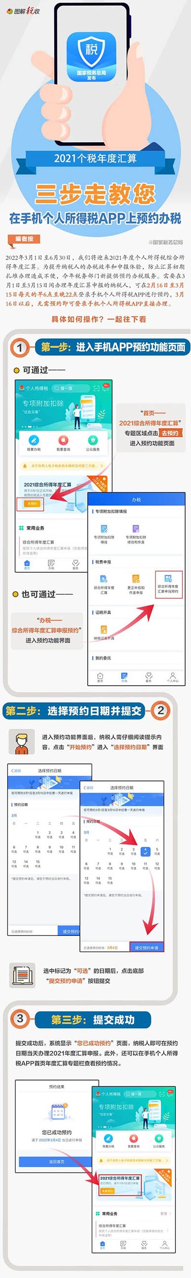3월 1일부터 3월 15일사이 년도결산신청을 취급한 납세자들은 2월 16일부터 3월 15일 매일 아침 6시부터 저녁 10시까지 휴대폰 개인소득세어플에 진입해 예약을 하면 되고 3월 16일 이후에는 예약없이 직접 휴대폰 개인소득세어플에 로그인해 취급하면 된다.