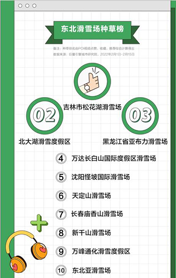 오션엔진은 틱톡 POI빅데터를 통한 좋아요, 즐겨찾기, 추천 등 차원의 데터 종합지표 분석을 통해 ‘동북스키장 추천순위’를 얻어냈다. ‘동계올림픽은 북경에서, 체험은 길림에서’ 해당 차트에서도 체현되였다 싶이 10위권중 길림성 스키장이 6개를 차지했고 그중 길림시 만과송화호리조트와 북대호리조트가 1, 2위를 차지했다. ‘동북스키장 방문순위’에서도 길림성 스키장은 5개를 차지했으며 만과송화호, 천정산스키장, 북대호가 각각 1~3위를 차지했다.