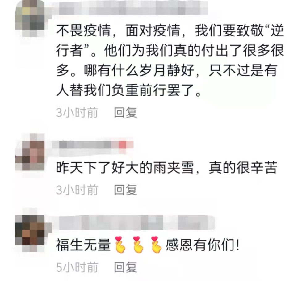 영상을 본 네티즌들은 분분히 "정말 쉽지 않습니다!" "당신들이 있어 너무 감사합니다!" "전염병 대처 '역행자'들에게 경의를 표합니다. 그들이 우리 대신 무거운 짐을 들어주고 있습니다." 등등 댓글을 남겼다.