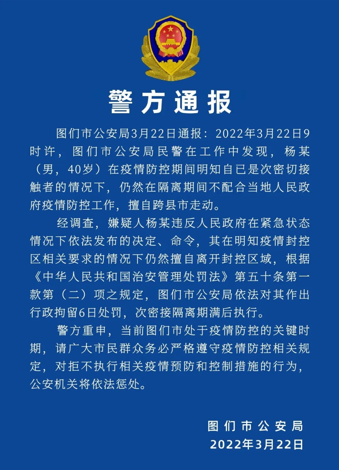 도문시공안국 3월 22일 통보: 2022년 3월 22일 9시경, 도문시공안국 민경은 업무중, 양모(남, 40세)가 전염병예방통제기간에 자신이 간접접촉자임을 알면서도 격리기간 당지 인민정부의 전염병예방통제사업에 협조하지 않고 사사로이 기타 현시로 이동한 것을 발견했다.