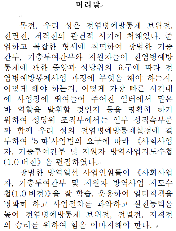 사회구역당조직에서는 령도적 역할을 충분히 발휘하여 사회구역전염병예방통제사업체계를 건전히 하며 ‘5화’사업법으로 사회구역격자화관리 종합예방통제조치를 실시하여 전염병예방통제의 첫 방선을 튼튼히 지켜야 한다.