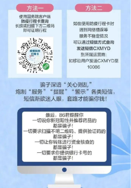 진정한 방역부문 사업일군은 개인위챗을 추가하여 그 어떤 자금 지급을 요구하거나 큐알코드 스캔을 요구하지 않으며 더욱이 개인계좌정보를 요구하지 않는다. 만약 당신의 행적코드에 이상이 나타났거나 본인이 가지 않은 지역이 나타나도 놀라지 말 것! 아래 두가지 방법으로 조회할 수 있다.
