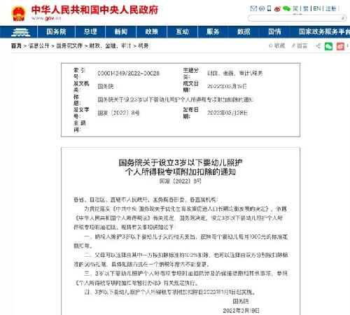 3월 28일, <3세 이하 영유아 돌봄 개인소득세 전문항목 부가공제를 설립할 데 관한 국무원의 통지>(이하 <통지>로 략칭)를 발부했다. <통지>는 <출산정책을 최적화해 인구의 장기적인 균형발전을 촉진할 데 관한 중공중앙 국무원의 결정>을 관철시달하기 위해 <중화인민공화국 개인소득세법> 관련 규정에 의거해 국무원은 3세 이하 영유아 돌봄 개인소득세 전문항목 부가공제를 설립하기로 결정했다.
