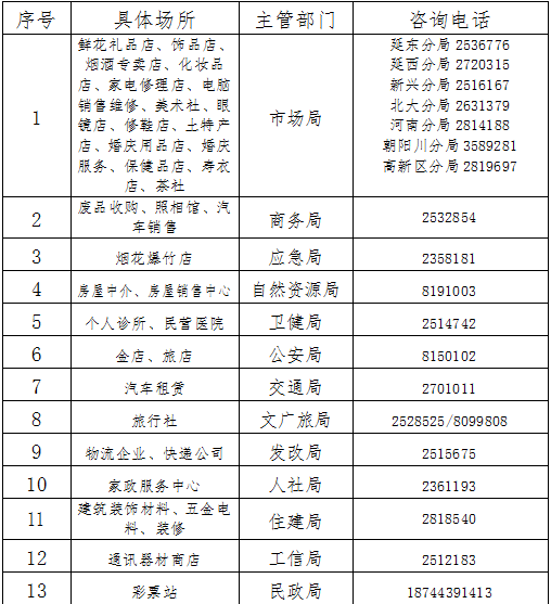 1) 종교활동 장소, 교육양성기구, 농업무역시장, 종합상가와 슈퍼, 대형연회장, 양로원, 술집(연예술집), 체육관, 헬스장, 요가관, 당구청, 문화체육예술류 양성기구, 미용원, 안마원, 양생회관, 기패실(마작활동실), 노래방, 무도청, 게임방, 스트립트 킬(방탈출)게임방, 인터넷카페, 영화관, 발안마가게, 목욕탕과 사우나, 수영장, 오락장소, 각 류의 풍경구 등 인원이 밀집하는 경영장소를 제외하고 기타 곳에서는 질서있게 경영을 회복한다.