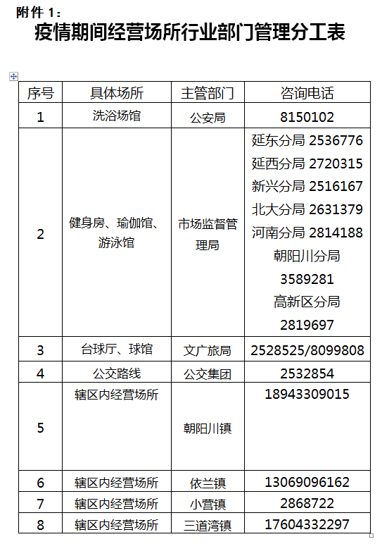 목욕탕과 사우나, 헬스장, 요가관, 수영장, 당구장, 체육관은 영업을 회복하고 공공뻐스도 운행을 회복한다. 기타 장소의 개방시간은 국가와 성, 주 전염병 상황 사업배치에 따라 4월 15일 발부하는 통고(4)를 기준으로 한다.