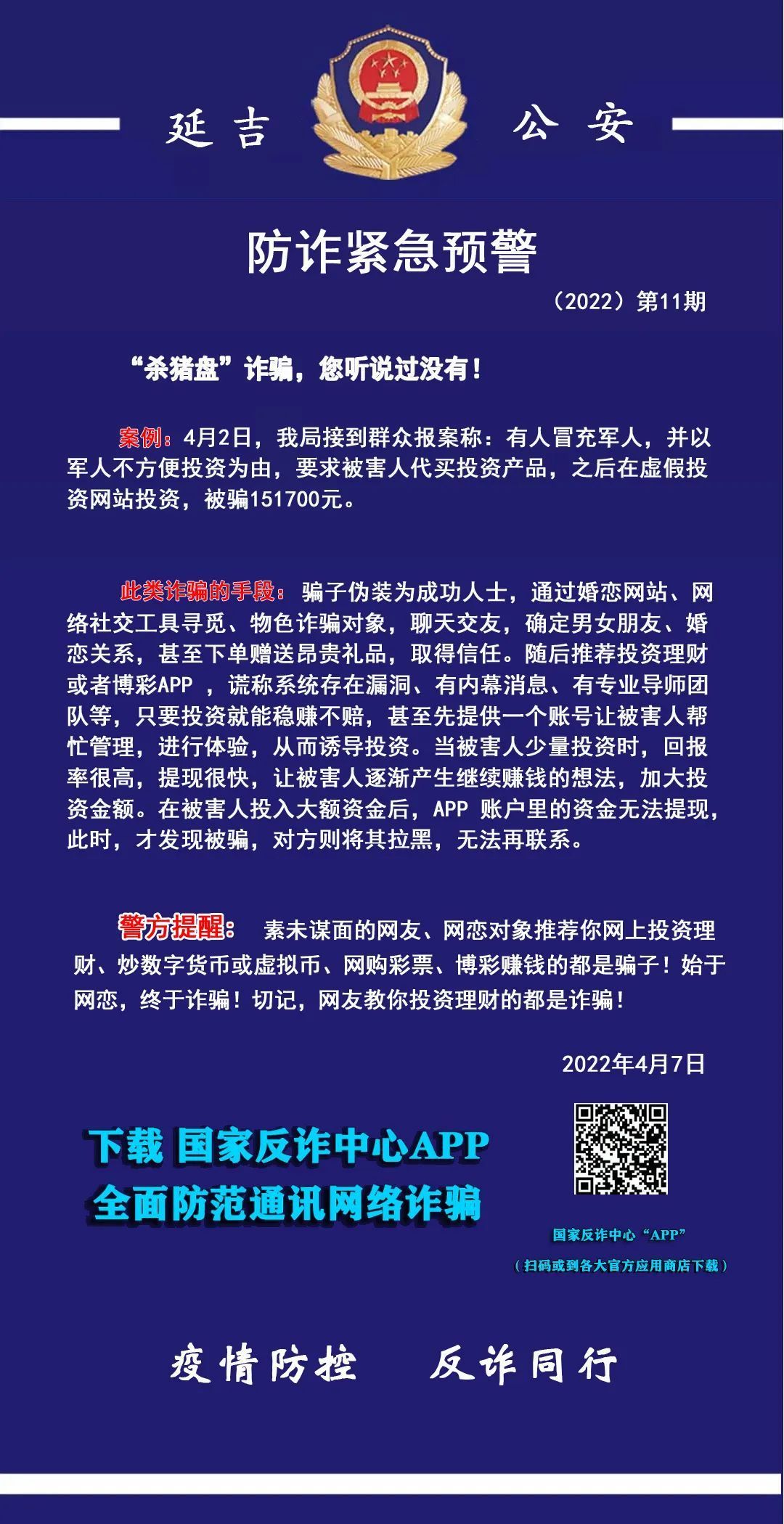 4월 2일 연길시공안국은 한 사람이 군인을 사칭해 군인이 투자하기 불편하다는 리유로 피해자에게 투자제품을 대신 구매해줄 것을 요구했고 그 후 거짓 투자 사이트에서 투자를 진행해 151,700원 사기 당했다는 제보를 받았다.