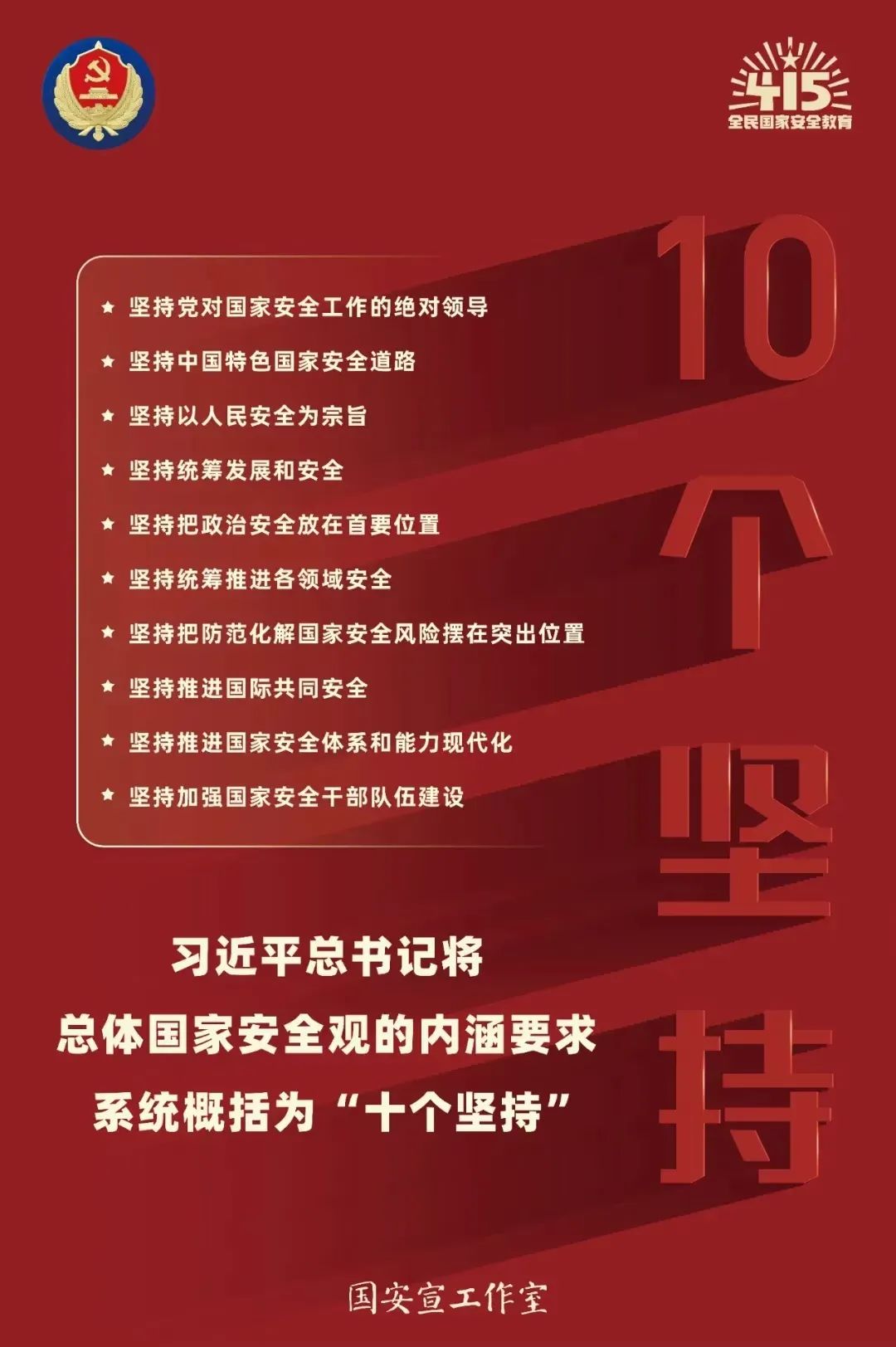 7번째 전민국가안전교양일을 맞으며, '국가안전선전작업실'은 '총체적 국가안전관을 단단히 수립하고 새시대 국가안전성과를 돌이켜보며 20차 당대회의 승리적인 소집을 맞이하는 데 량호한 분위기를 구축하자' 포스터를 발포했다.