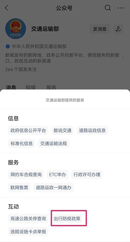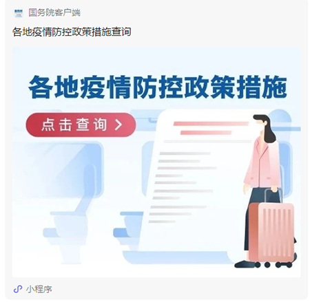 이런 정보들은 국무원 클라이언트 미니응용프로그람 ‘각지 예방통제정책’ 코너에서 조회하거나 교통운수보 위챗 공식계정 ‘출행방역정책’을 클릭하여 조회할 수 있다.