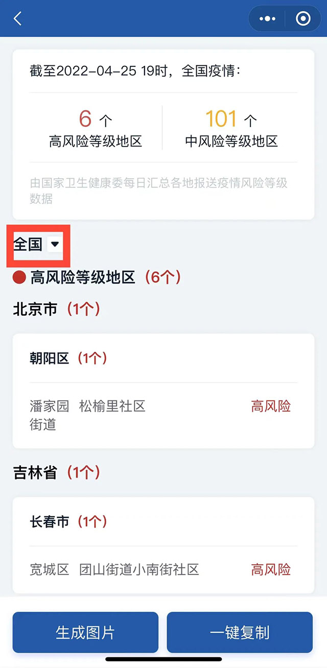 ‘전국’을 클릭하여 조회하려는 성(자치구, 직할시)를 선택하면 이 도시(구)의 최신 중고위험전염병발생지역 명단을 볼 수 있다.
