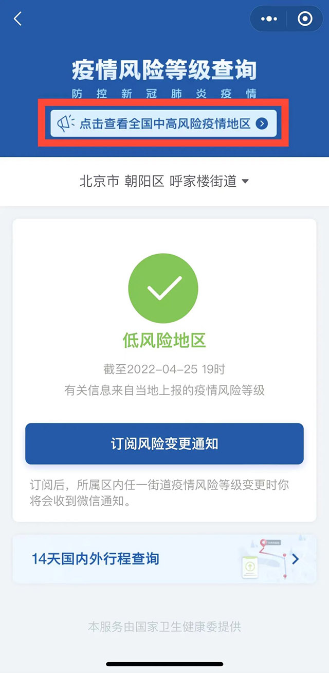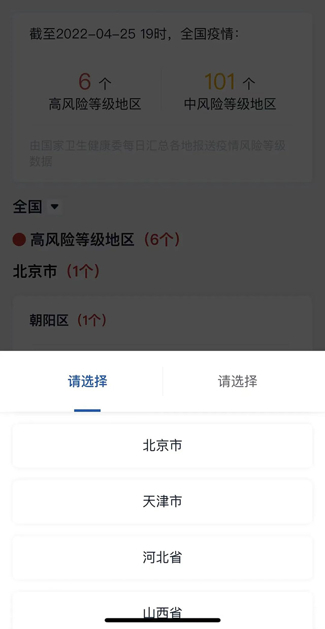 국무원 클라이언트 미니응용프로그람의 ‘전국 중고위험지역 명단'조회서비스에 새로운 기능이 생겼다! 전국 중고위험지역을 조회할 수 있을 뿐만 아니라 성과 시에 따라 조회할 수 도 있다.