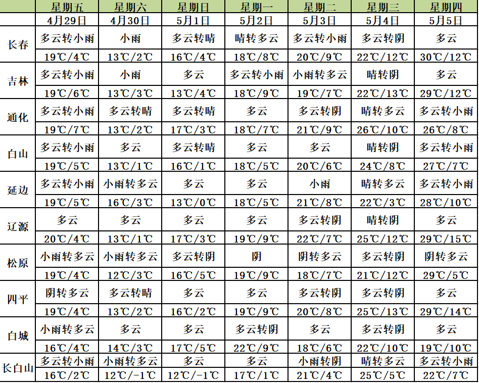 30일 밤부터 5월 1일 낮까지 전성 대부분 지역에 구름이 많고 송원 동북부, 장춘, 사평 동남부, 료원, 길림, 통화, 백산, 연변, 장백산보호구에 소나기가 내릴 전망이다.