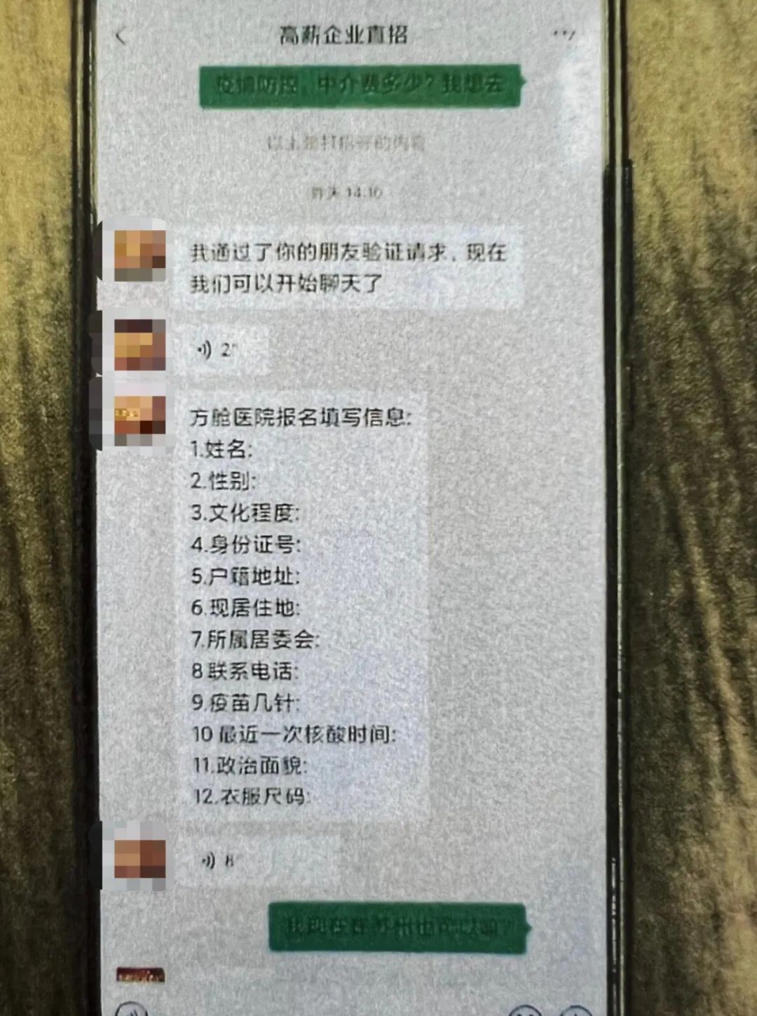 위챗 추가후, 상대방은 먼저 설모에게 개인정보를 기입하라고 하면서 자원봉사자 모집 조건을 알려주었다. “하루 임금은 2000원이고 채용 조건은 간단한바 백신 3차 접종을 마친 45세 미만 성인이면 됩니다. 이밖에 숙식 등을 제공하고 전용차로 출퇴근합니다. 다만 중개비 500원을 선불해야만 예약할 수 있습니다. "