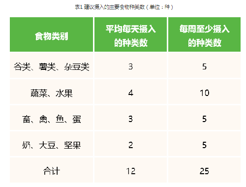 ● 매일 평균 12가지 이상의 음식을 섭취해야 하고 매주 25가지 이상의 음식을 섭취해야 하며 이를 합리하게 조합해야 한다.