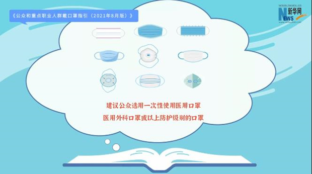 국가위생건강위원회가 발표한 <대중과 중점직업군 마스크착용지침(2021년 8월판)>에 따르면 대중들이 1회성 의료용 마스크, 의료용 외과마스크 및 그 이상 방호등급의 마스크를 착용할 것을 권장했다. 1회성 의료용 마스크, 의료용 외과마스크 및 더 높은 등급의 미립자방호마스크에는 모두 엄격한 집행표준이 있다. 이 표준에는 마스크의 세균려과효률, 통기저항 등에 대하여 명확한 규정이 있다. 국가위생건강위원회가 일반인에게 권장하는 마스크 집행표준은 모두 마스크 겉포장에서 찾을 수 있다. 례를 들어 의료방호용 마스크 집행표준은 GB 19083-2010, 의료용 외과마스크 집행표준은 YY 0469-2011, 1회성 의료용 마스크 집행표준은 YY/T 0969-2013이다. 전염병상황이 반복되고 있는 상황에서 방호의식을 향상시켜야 하는바 마스크를 고를 때 집행표준이 있는 합격된 의료용 마스크를 선택해야 만이 더 나은 방호효과를 볼 수 있다.