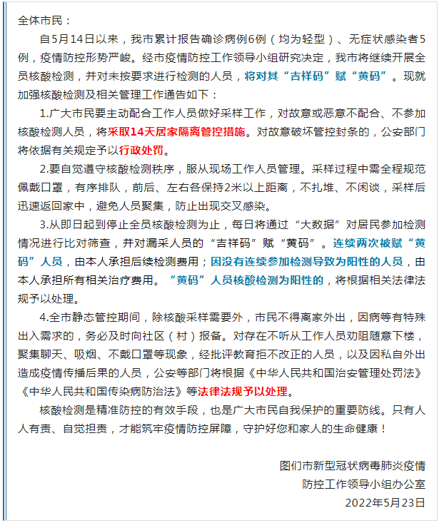 통고에서는 광범한 시민들이 핵산검측에 적극 협조할 것을 호소하면서 고의, 악의적으로 핵산검측에 협조하지 않거나 참가하지 않는 인원에 대해서는 14일간 자가격리관리통제조치를 취하고 고의로 관리통제 봉인을 파괴할 경우 공안부문에서 관련규정에 따라 행정처벌을 안길 것이라고 했다.