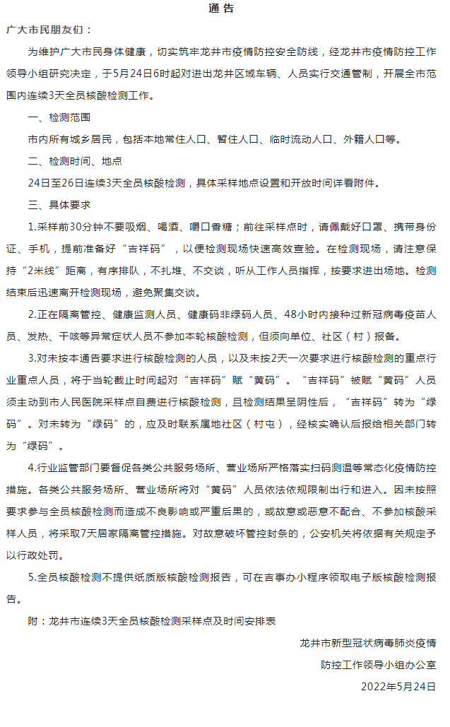 오늘(24일) 룡정시는 통고를 발부하여 5월 24일 6시부터 룡정구역을 진출입하는 차량, 인원에 대해 교통관리통제를 실시하고 전시 범위내에서 련속 3일간 핵산검측을 전개한다고 밝혔다.