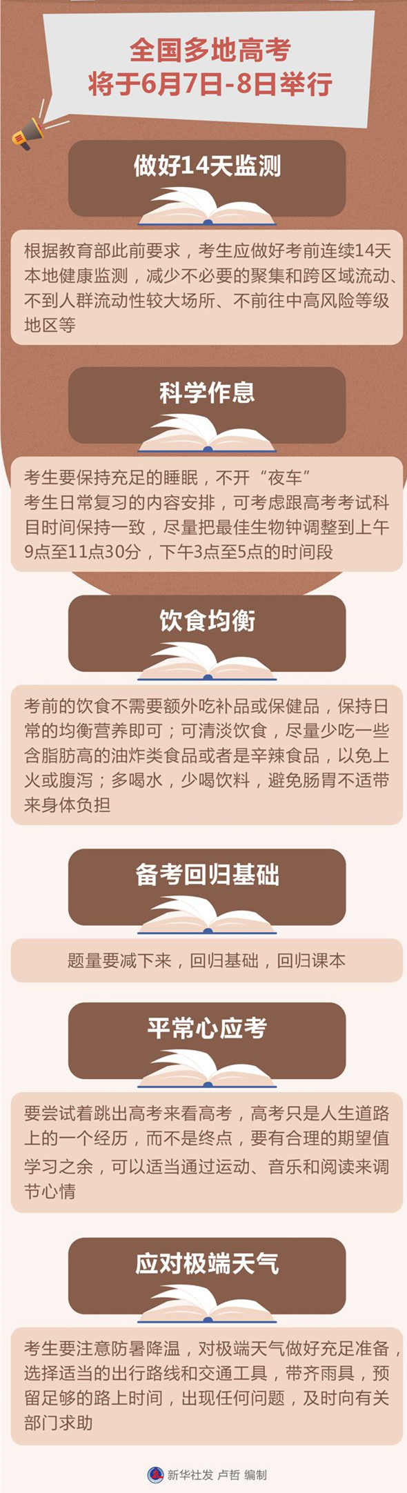 【과학적인 학습과 휴식】개인방호를 주의하는 외에 과학적인 학습과 휴식은 건강의 보증이다. 광주시제5중학교 고3학년 학년장 증소아는 수험생이 충족한 수면을 유지하고 ‘밤샘’학습을 하지 말 것을 건의했다. 수험생은 일상 복습내용을 배치할 때 대학입시 시험과목시간과 일치하게 배치하고 최적의 생체리듬을 오전 9시부터 11시 30분까지, 오후 3시부터 5시 시간대가 되도록 조정해야 한다.