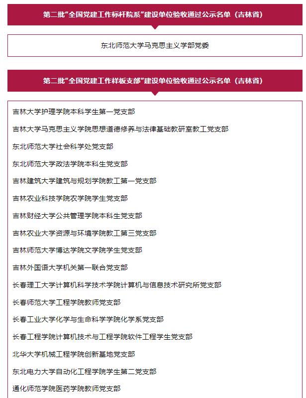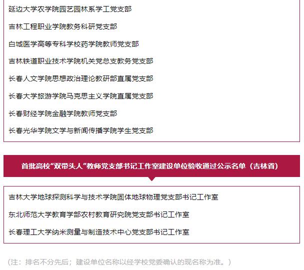 5월 24일, 교육부 사상정치사업사는 제2진 새 시대 대학교 당건시범건설, 품질우량사업과 첫 대학교 ‘쌍선줄군(双带头人)’ 교원 당지부서기작업실 건설단위 검수결과를 공시했다. 9개 대학교 당위, 98개 학과 당조직, 990개 당지부, 99개 ‘쌍선줄군’ 교원 당지부서기작업실이 검수에서 통과되였다. 첫 새 시대 대학교 당건 시범창건과 품질우량사업 건설기간을 연장한 하나의 학과 당조직, 하나의 당지부가 2차 검수에서 통과되였다.