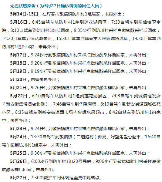 5월 28일 0-24시, 훈춘시에서 무증상 감염자 1명이 새로 증가되였다. 이 감염자의 이동경로는 다음과 같다.