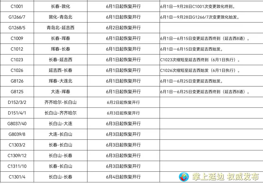 중국철도심양국집단유한회사 연길차무단에서 료해한 데 따르면 오늘부터 연길로 향하는 렬차 여러편이 통행을 회복했다고 한다. 한편, 부분적 렬차의 출발역과 종점역이 조정되였다.