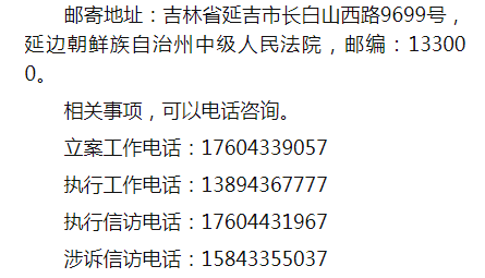 인터넷조작이 불편할 경우에는 우편으로 립건하고 집행하며 신소재료 접수처리(우편물봉투에 '립건재료' '집행재료' '신소재료' 등을 표기해야 한다.)할 수 있다. 주중급인민법원은 정상적인 사무를 회복한 후 제1시간에 처리할 것이다. 이에 따르는 불편한 점에 대해 량해를 바란다.