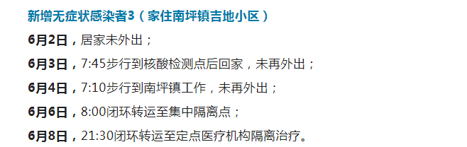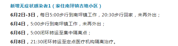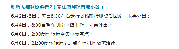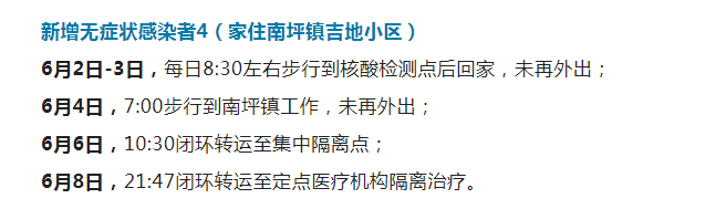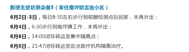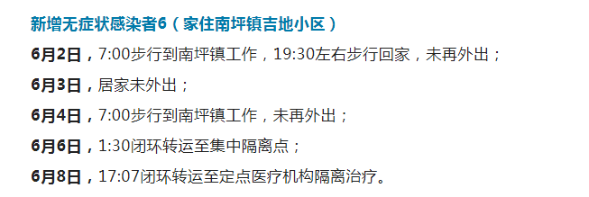 6월 9일 0-24시, 화룡시에서 무증상 감염자 6명이 새로 증가되였는데 모두 집중격리관리통제인원이다. 새로 증가된 무증상 감염자의 이동경로는 다음과 같다.