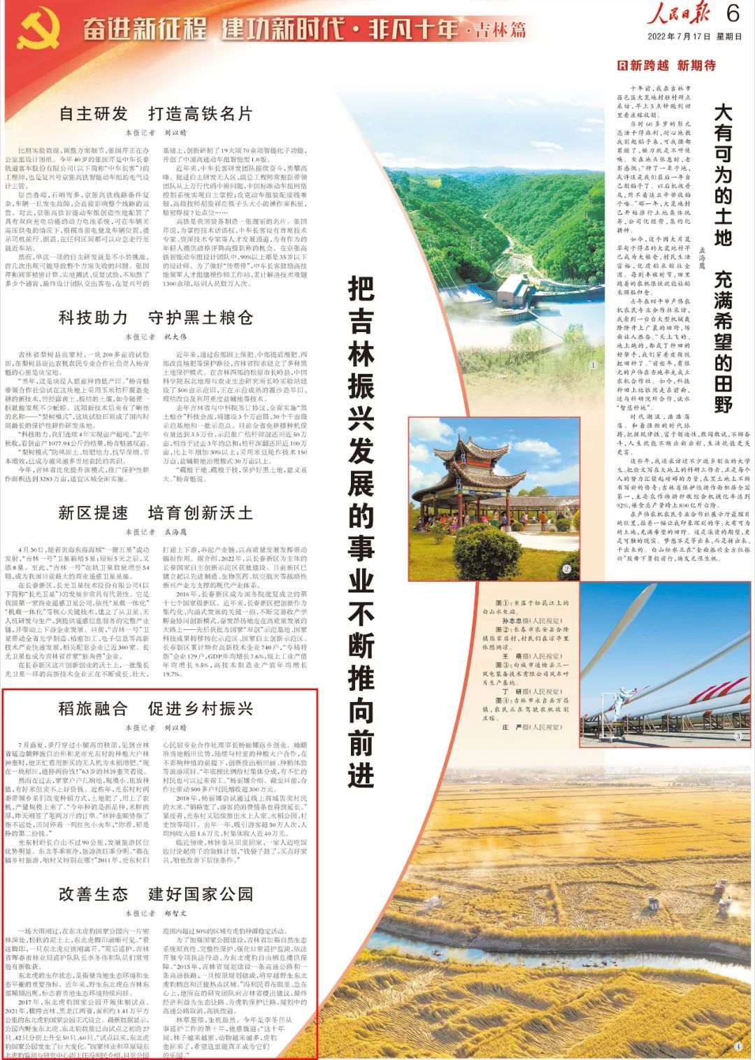 7월 17일 《인민일보》 제6면에는 《길림 진흥발전 사업을 부단히 추진하자》란 문장이 실렸다. 문장은, "길림성 연변조선족자치주 화룡시 광동촌은 벼재배와 관광을 융합시켜 향촌진흥을 촉진하고 있다. 동북범표범국가공원에는 야생동북범이 빈번히 출몰하고 있고 생태환경이 지속적으로 호전되고 있다..."고 썼다.