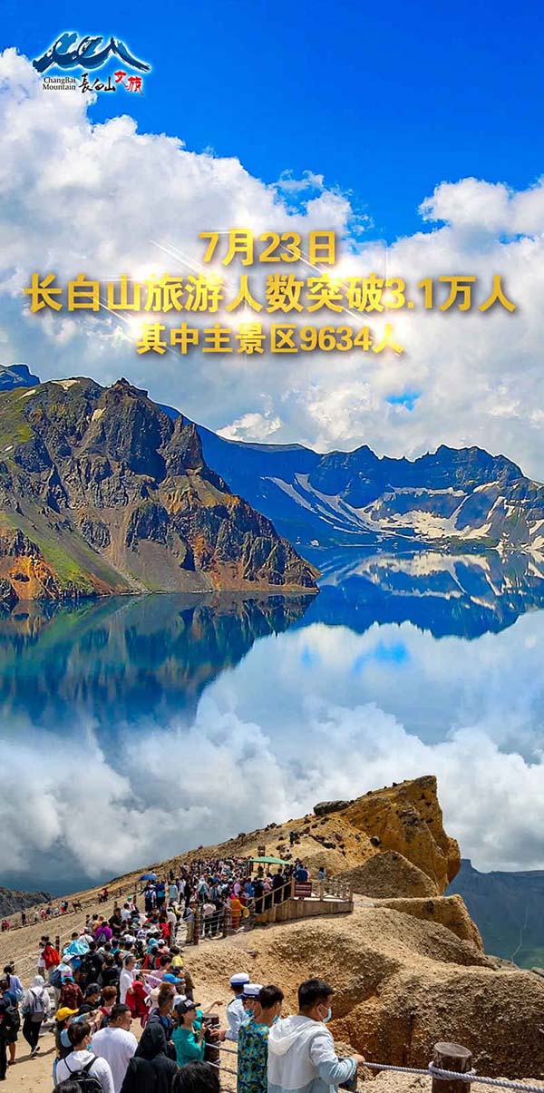 장춘 7월 23일발 인민넷소식(리양): 장백산관리위원회의 소식에 의하면 7월이래 장백산은 관광객 총 337770명을 접대했다고 한다. 7월 23일 하루에만 관광객 3.1만명을 접대했는데 그중 주요풍경구에서 9634명을 접대해 장백산이 관광업 회복전문활동을 다그쳐 추진한 이래 재차 최고치를 달성했다.