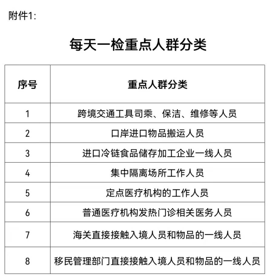 국경을 오가는 교통도구에 탑승한 인원과 청결 및 수리인원, 통상구 수출입화물 운반인원, 집중격리점 사업일군, 의료기구 사업일군 등은 매일 핵산검측을 진행해야 한다. (부록 1) 종사환경이 인원이 밀집되여 접촉자가 빈번하고 류동성이 높은 종사인원(이를테면 택배, 배달, 호텔서비스, 인테리어 하역서비스, 교통운송서비스, 상가슈퍼마켓, 농산물집산무역시장 사업일군), 통상구관리봉사인원 등은 매주 두차례 핵산검측을 진행해야 한다. (부록 2)