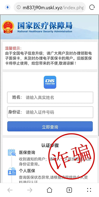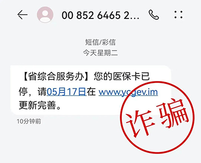 최근 불법분자들은 의료보장국을 사칭하여 문자 혹은 전화를 통해 사기극을 벌이고 있는데 ‘당신의 의료보험자료가 부족해 잠시 사용이 중단되였다’, ‘당신의 의료보험이 전자버전을 업데이트하지 않아 잠시 보험료를 결산할 수 없다’는 내용을 보내 시민이 피싱링크를 클릭하도록 유도한 후 자료를 업로드하게 하여 은행카드를 도용한다. 보험에 참가한 인원은 불법분자가 보내온 사기문자와 링크를 절대 클릭하지 말아야 하는데 그 속에는 바이러스링크가 포함되여있어 화면 속 안내에 따라 신분증번호, 은행카드번호 등을 기입하면 은행카드가 도용될 수 있다.