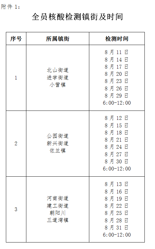 성, 주 신종코로나페염전염병예방통제사업지도소조의 요구에 따라 당면 전염병 예방통제형세와 결부해 전염병의 전파를 효과적으로 차단하고 인민대중의 신체건강과 생명안전을 보장하고저 연길시신종코로나페염전염병예방통제사업지도소조는 연구를 거쳐 2022년 8월 11일부터 9월 3일까지 기간 매 3일마다 한차례 검측하는 원칙으로 지정된 시간, 지정된 구역에서 전원 핵산검측을 전개하기로 결정했습니다. 지금 관련 사항을 아래와 같이 통고합니다.