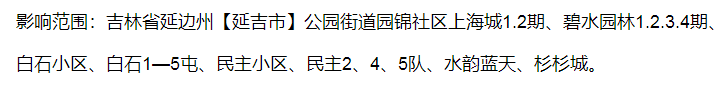 영향범위: 길림성 연변주 연길시 공원가두 원금사회구역 상해성 1, 2기, 벽수원림 1, 2, 3, 4기, 백석주거단지, 백석 1-5툰, 민주주거단지, 민주 2, 4, 5대, 수운람천, 삼삼성.