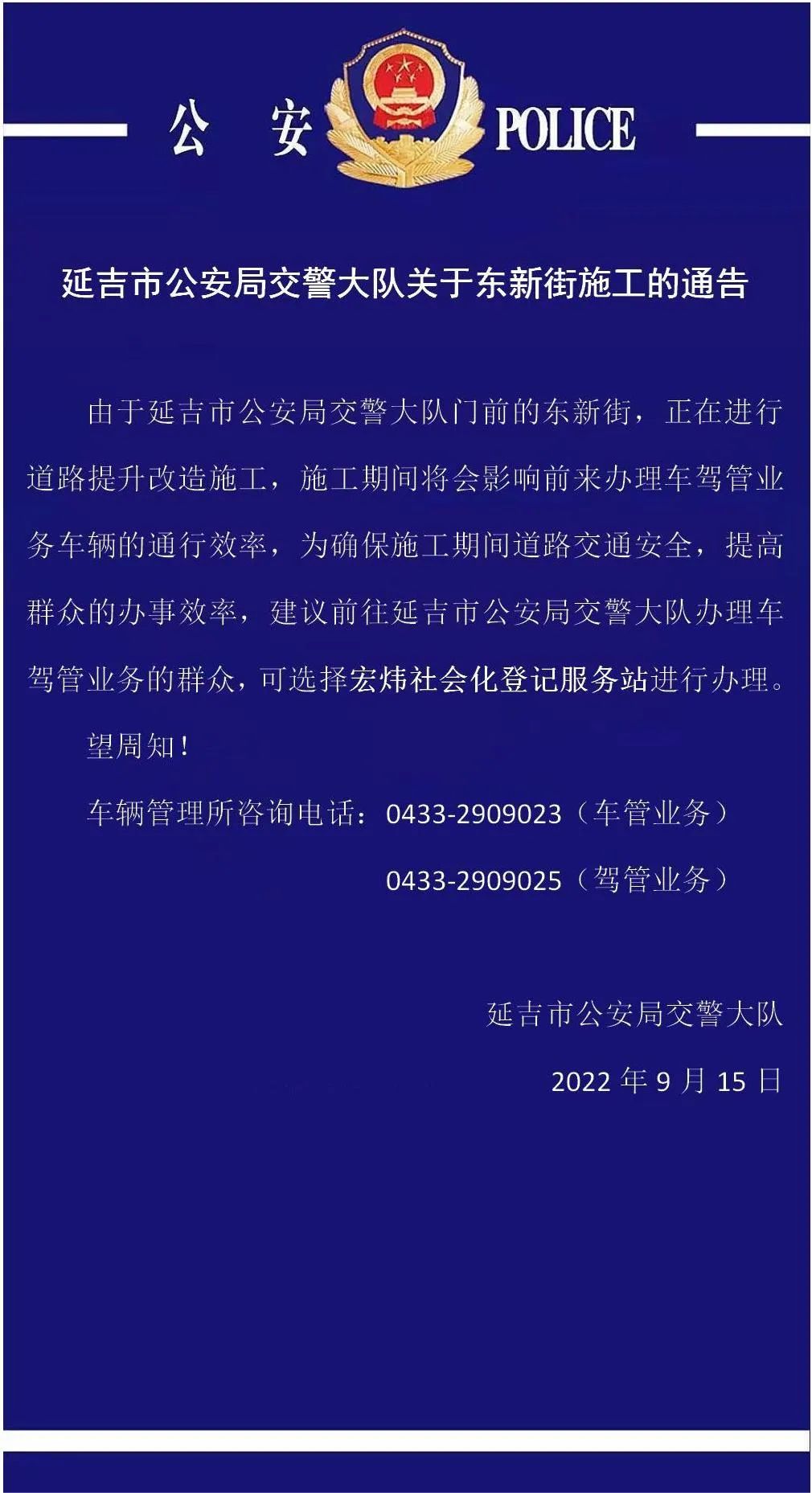 연길시공안국 교통경찰대대 문앞의 동신거리에 대해 도로 승격개조 시공을 진행하므로 시공기간 차량운전관리 업무를 처리하러 온 차량의 통행효률에 영향주게 된다. 시공기간 도로 교통안전을 확보하고 군중의 업무처리효률을 높이고저 연길시공안국 교통경찰대대에 차량운전관리 업무를 처리하러 오는 군중이 굉위사회화등록봉사소에 가서 업무를 처리할 것을 건의한다.