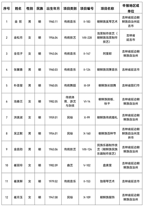 문화관광부 판공청 <제6차 국가급 비물진문화유산 대표적 전승인 추천 및 신청 사업을 전개할 데 관한 통지>(판비유발[2022]85호)에 따라 연변주문화라지오텔레비죤방송및관광국은 올 6월 제6차 국가급 대표성 전승인에 대한 추천 및 신청 사업을 가동했다. 현, 시 및 관련 부문의 추천과 연변주문화라지오텔레비죤방송및관광국의 검토를 거쳐 제6차 국가급 비물진문화유산 대표적 전승인 추천 및 신청 명단이 형성되였는바 총 12명이다.