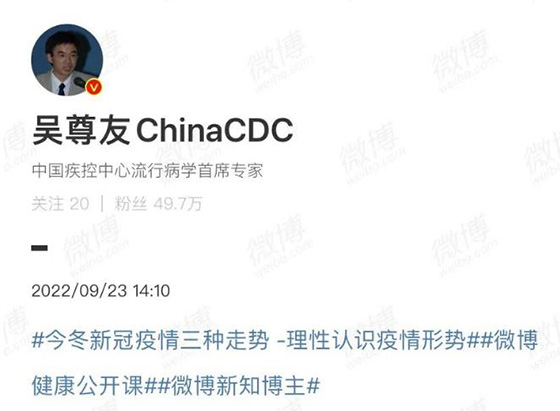 9월 23일, 중국질병예방통제센터 류행병학 수석전문가 오존우는 자신의 미니블로그에서 올겨울 신종코로나페염 전염병상황 추세는 아직 판단하기 어렵지만 전염병상황 추세는 세가지 가능한 정경이 있다고 밝혔다.