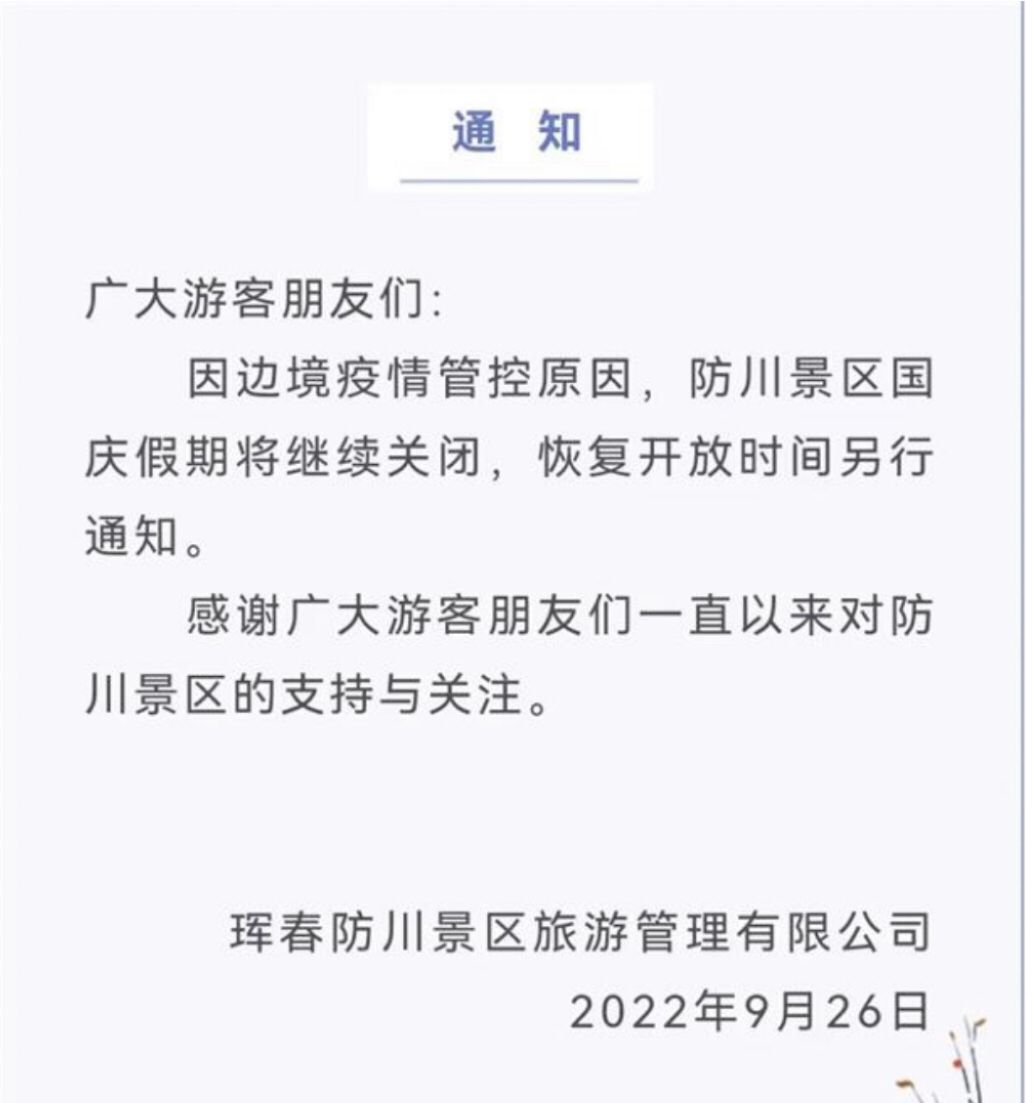 오늘, 관련 부문에서 료해한 데 따르면 올해 국경절련휴기간, 훈춘방천풍경구는 계속해 대외에 개방하지 않는다고 한다.