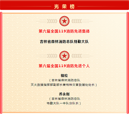 최근 응급관리부는 제6회 전국 119소방 선진단체와 선진개인 표창 결정을 발표해 149개 단위에 ‘제6회 전국 119소방선진단체' 칭호, 195명의 개인에게 ‘제6회 전국 119소방 선진개인' 칭호를 수여했으며 이중 길림성 5개 단위, 개인 7명이 명단에 올랐다.