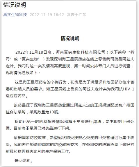 진실생물은 이는 해왕성진약방의 개별적인 행동으로서 원래는 심천지역 일부 향향 왕래 및 출국인원의 수요를 만족시키기 위한 것이라고 표시했다. 해왕성진에서 온라인판매한 아즈부딘은 사실상 회사의 항HIV-1 적응증 약물이라고 한다.
