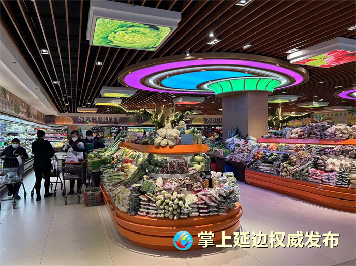 연길백화청사 슈퍼마켓 영업시간은 저녁 9시까지 연장되였고 량식, 기름, 고기, 남새, 과일, 닭알, 우유 등 민생물자 및 생활필수품 종류가 다양하고 물자공급원이 충족하다. 구역마다 모두 전문인원이 책임지고 판매정황에 따라 수시로 물자공급원을 보충하고 있다.