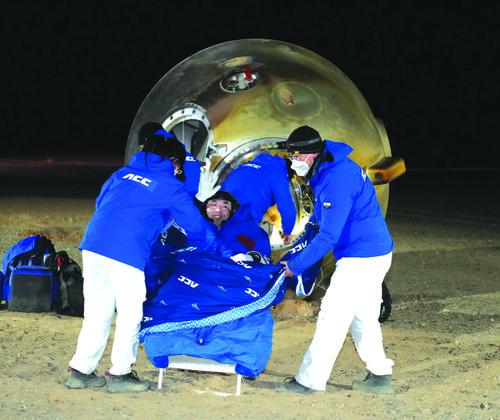 동풍착륙장에 성공적으로 착륙한 신주14호 유인우주선 귀환선. 신화사
