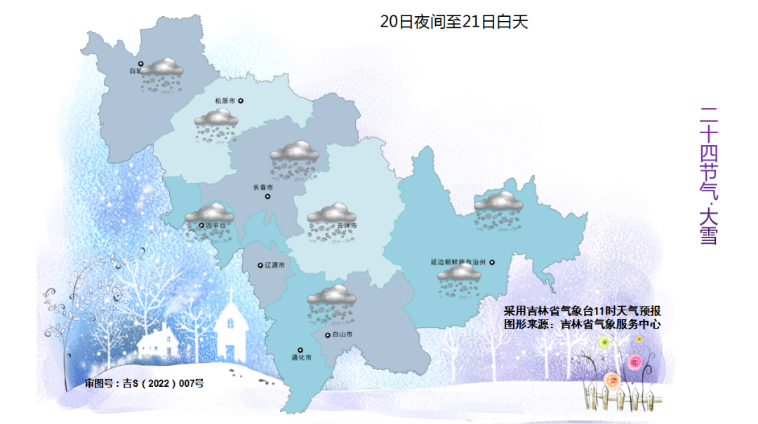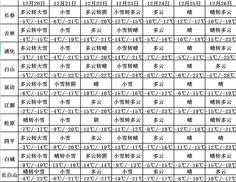 20일 밤부터 날씨가 급변하면서 한차례 폭설이 내리게 되고 23일까지 줄곧 눈이 내릴 것으로 보이는 가운데 주로 20일 밤부터 21일 낮까지 집중적으로 내리겠다. 그중 송원 동북부, 장춘, 사평, 료원, 길림, 통화, 백산 대부분 지역, 연변 북부와 동부, 장백산보호구에 큰 눈 혹은 폭설이 내리겠다. 연변 동부의 일부 지방은 대폭설이 나타날 수 있고 기타 지역은 적은 눈에서 중등 정도의 눈이 내리겠다.