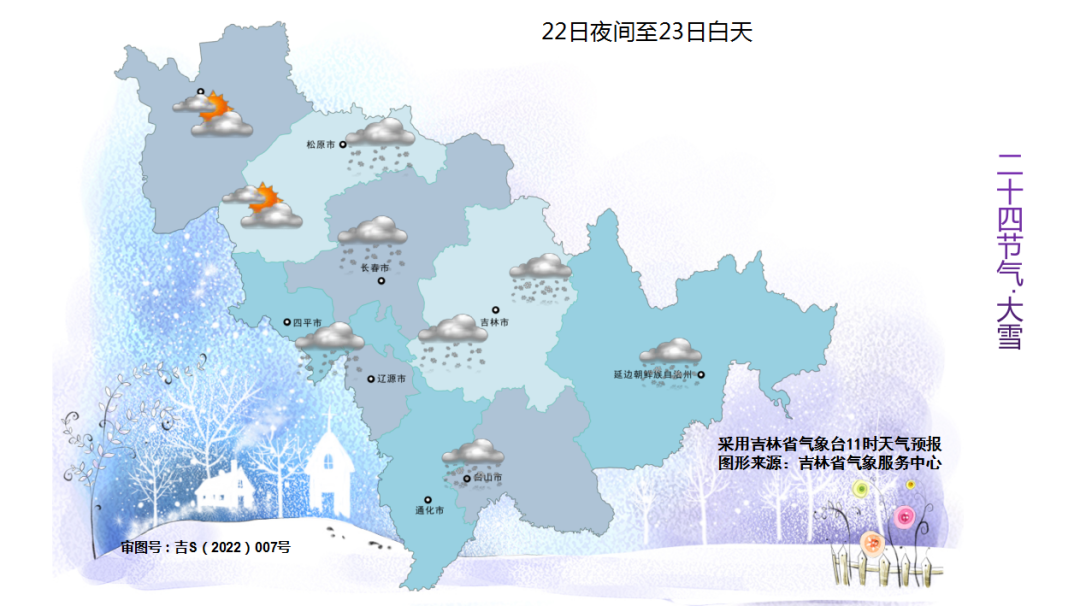 22일 밤부터 23일 낮까지 송원 동부, 장춘, 사평, 료원, 길림 서부에 적은 눈이 내리겠고 길림 동부, 통화, 백산, 연변, 장백산보호구에 적은 눈에서 중등 정도의 눈이 내리겠다.