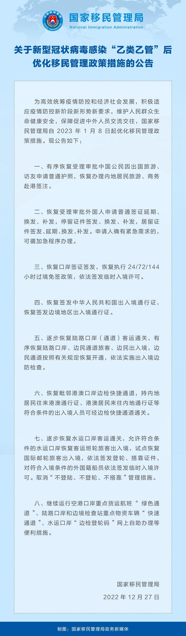 전염병예방통제와 경제사회발전을 효률적으로 총괄하고 전염병예방통제 새 단계, 새 형세, 새 요구에 적극적으로 적응하며 인민군중들의 생명건강안전을 수호하고 중외인원 교류왕래를 보장하고 촉진하기 위해 국가이민관리국은 2023년 1월 8일부터 이민관리정책조치를 최적화하기로 했다. 현재 다음과 같이 공고한다.